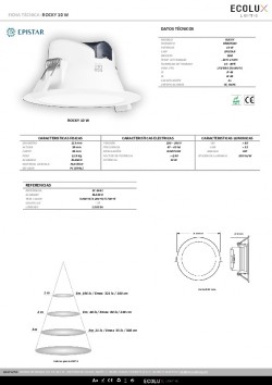-Chip: EPISTAR. -Ajustável (Dim): Sim. -Temp. trabalho: -20ºC a 50ºC. -Umidade de trabalho: 10-80%. -Vida útil: L70/B30 (30.000 h). -IP: IP44. -IK: IK08. -Classificação: A+. CARACTERÍSTICAS FÍSICAS -Acabamento: Branco. -Material da caixa: Plástico. -Difusor: PC (opala). CARACTERÍSTICAS ELÉTRICAS -Tensão: 220–240 V. -Frequência: 47–63 Hz. -Regulação: DIM PUSH. -Fator de potência: >0,90. CARACTERÍSTICAS DE ILUMINAÇÃO -CRI: >80. -Ângulo: 90º. -Eficiência luminosa: 100 lm/W.