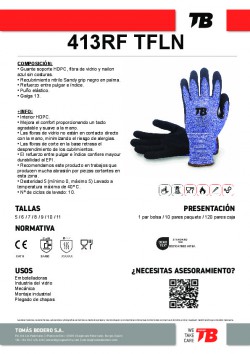 Luva de suporte em nylon azul sem costuras, fibra de vidro e HDPC. Revestimento de nitrilo preto Sandy grip na palma da mão. Reforço entre o polegar e o indicador. Punho elástico. Calibre 13. Interior HDPC. Melhora o conforto proporcionando um toque agradável e macio à mão. As fibras de vidro não ficam em contato direto com a mão, minimizando o risco de alergias. As fibras cortadas na base retardam o desprendimento dos revestimentos. O reforço entre o polegar e o indicador confere maior durabilidade ao EPI. Recomendamos este produto em trabalhos que produzam muita abrasão de peças cortantes nesta área. Destreza 5 (mínimo 0, máximo 5). Lavar a uma temperatura máxima de 40ºC. Número de ciclos de lavagem: 10. -Principais aplicações: Mecânica, Montagem, Indústria vidreira, Engarrafadoras, Dobragem de chapas, etc.